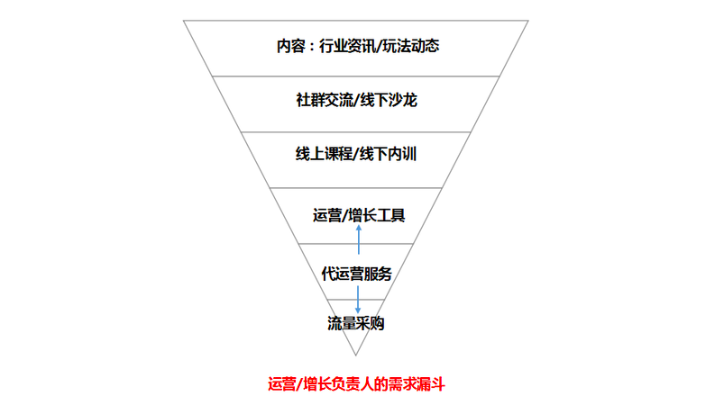 例如各公司里「运营/增长负责人的需求漏斗」:他们除了需要做运营/增长方案,还有看文章咨询了解行业动态的需求、在群里讨论交流问题的需求、上课学习的需求、买一些运营工具的需求。