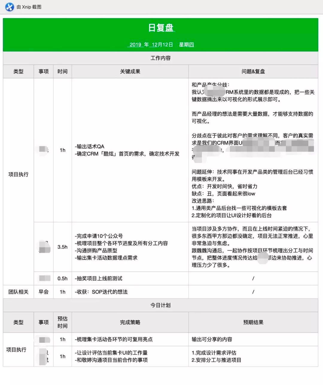 很多人很讨厌写日报、周报、月报,以前我也是这么想的、那是因为用法不对;不要把复盘当做是一个汇报、而是记录当天工作过程中你做的每一个决策、对应都导致了什么结果,很多时候当你被琐碎的事物包围时、会限制你的脑洞、拉低你的智商(乌合之众效应)