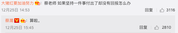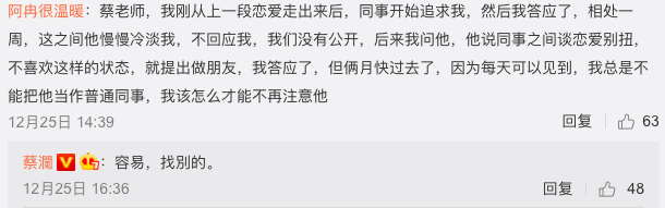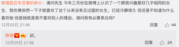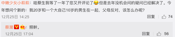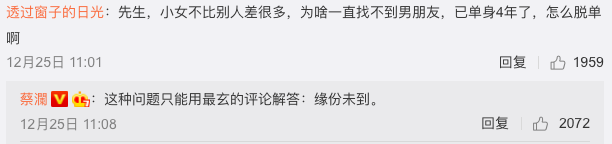 或许是临近年关,大家的困惑太多,蔡澜先生的这条微博引来了无数网友的围观与参与,目前这条微博下面的评论已经超过11万。小声说一句,去年的那条答疑微博的评论还不足4万,看来大家的烦恼、困惑真的一年比一年多呢。