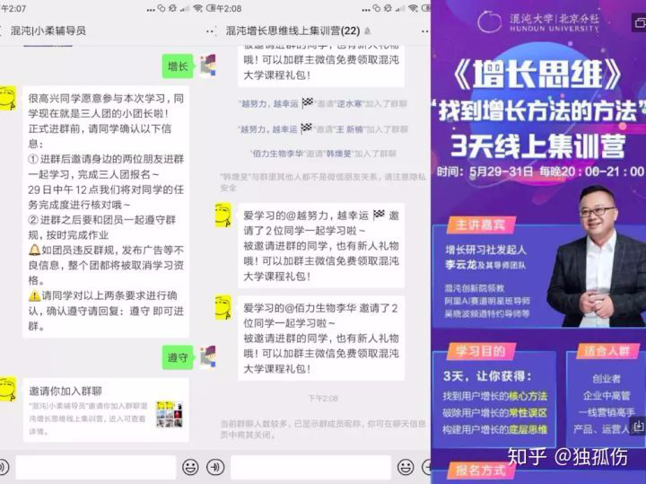 比如「混沌大学」北京分社就以3人拼团的名义使用此策略扩大微信群,但笔者认为体验不是特别好,首先太容易被截流,其次是完成邀请获得奖励后就可以退群,留存性不好。