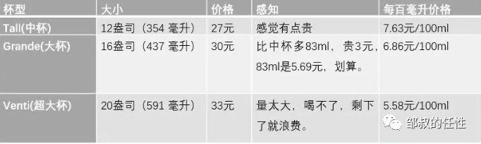 从上面表格最后一列也可以看出,中杯、大杯、超大杯分别百毫升价格在7.63元、6.86元、5.58元,当然是越大杯越划算。