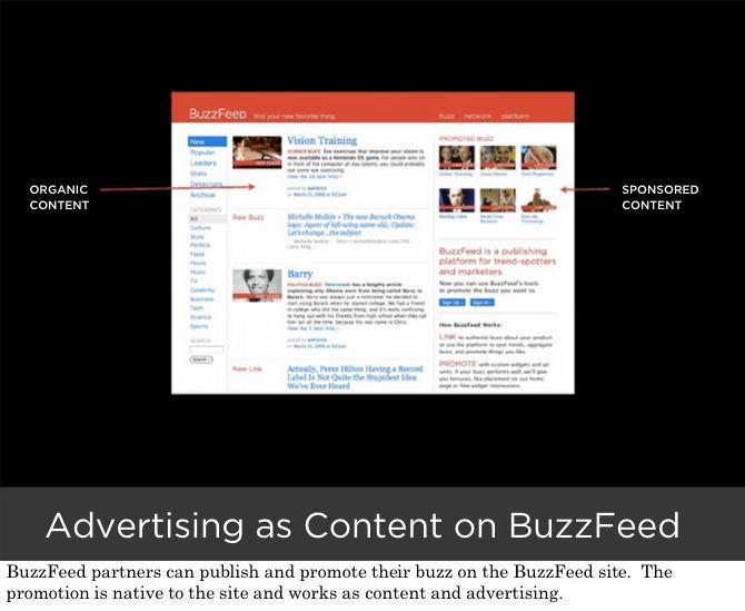 早期BuzzFeed的大多数分享都是基于朋友之间。当这个网站慢慢地吸引用户以后,博主们开始从BuzzFeed中寻找自己想要的资源了。到了2008年4月,BuzzFeed月收入达到了60万美元,而且帖子经常被知名博主们引用。与此同时,原生广告的创意为其筹集了350万美元。后文将会有所涉及。