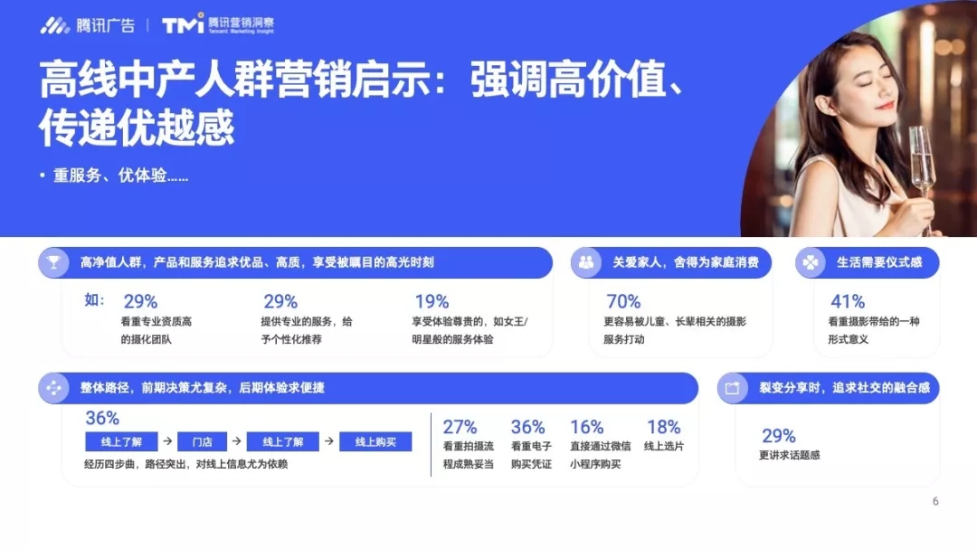 高线中产指的是一线和新一线城市中,每月家收超过2万的人群。这类群体追求的是更高质量的产品和服务,借此“强调高价值、传递优越感”;此外有36%的人选择由“线上了解——门店——线上了解——线上购买”的整体购买路径,可以看出高线中产群体对线上信息尤为依赖。