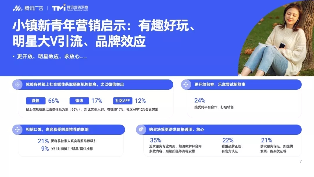 坐标三四线城市的小镇新青年们较容易“被带货”,有21%的人“更容易被素人真实客照推荐吸引”,同时9%的人“关注时尚博主/明星/网红推荐”。在获取摄影机构信息的渠道上,微信体系依然是独占鳌头,达到66%,微博和社区APP分别占17%和12%。