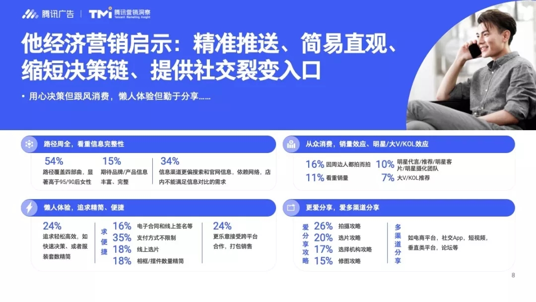 最后不妨来关注一下常常处在被忽略边缘的“他经济”,如今男性群体的消费能力和意愿也是极为可观的。他们追求信息的完整,乐于分享,也容易受明星效应的影响导致跟风消费。同时有24%的人“追求轻松高效”,另有24%的人表示“更乐意接受跨平台合作,打包销售”,这种“懒人心态”一定让女性朋友们想起了跟男性一起逛街的恐惧。