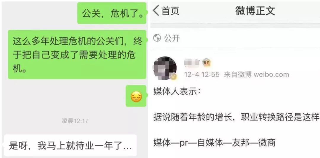 这从007认识的不少公关品牌市场总监的“快闪”可见一斑,2019年9月左右,007还在跟他们愉快合作,等12月再次联系的时候,不少已经离职或跳槽,有的加入了“保险”一族,有的变成了“微商”,大多数表示“公司没钱啦/钱不够啦,预算少了,自然也不要那么多人啦……”