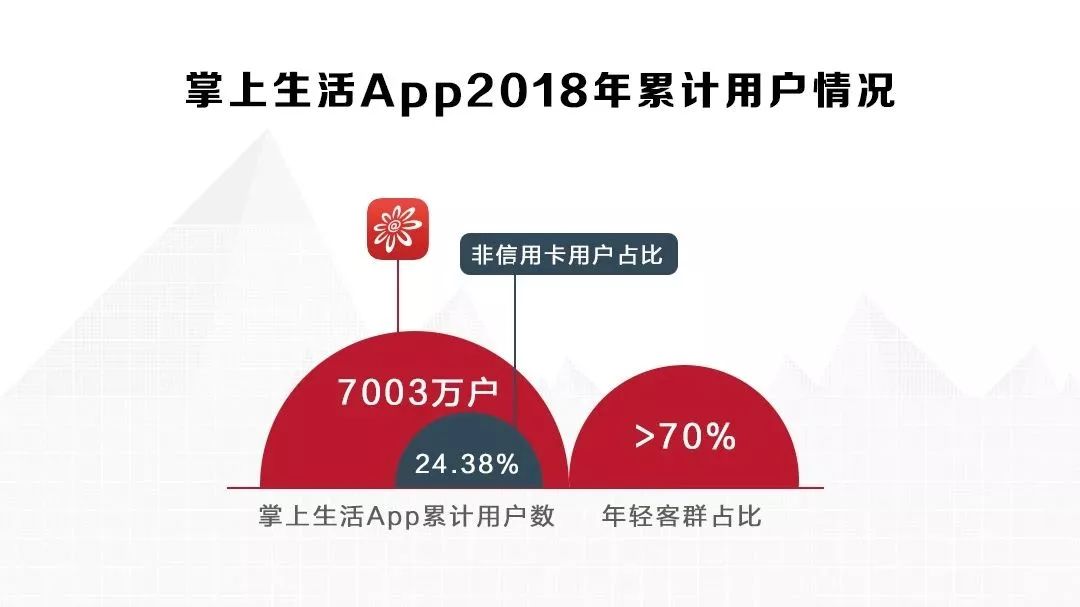 据招商银行公布2018年报显示,掌上生活APP累计用户数7002.73万户,其中非信用卡用户占比24.38%,年轻客群占比超过70%,客户规模和活跃度持续领跑同业信用卡类APP。