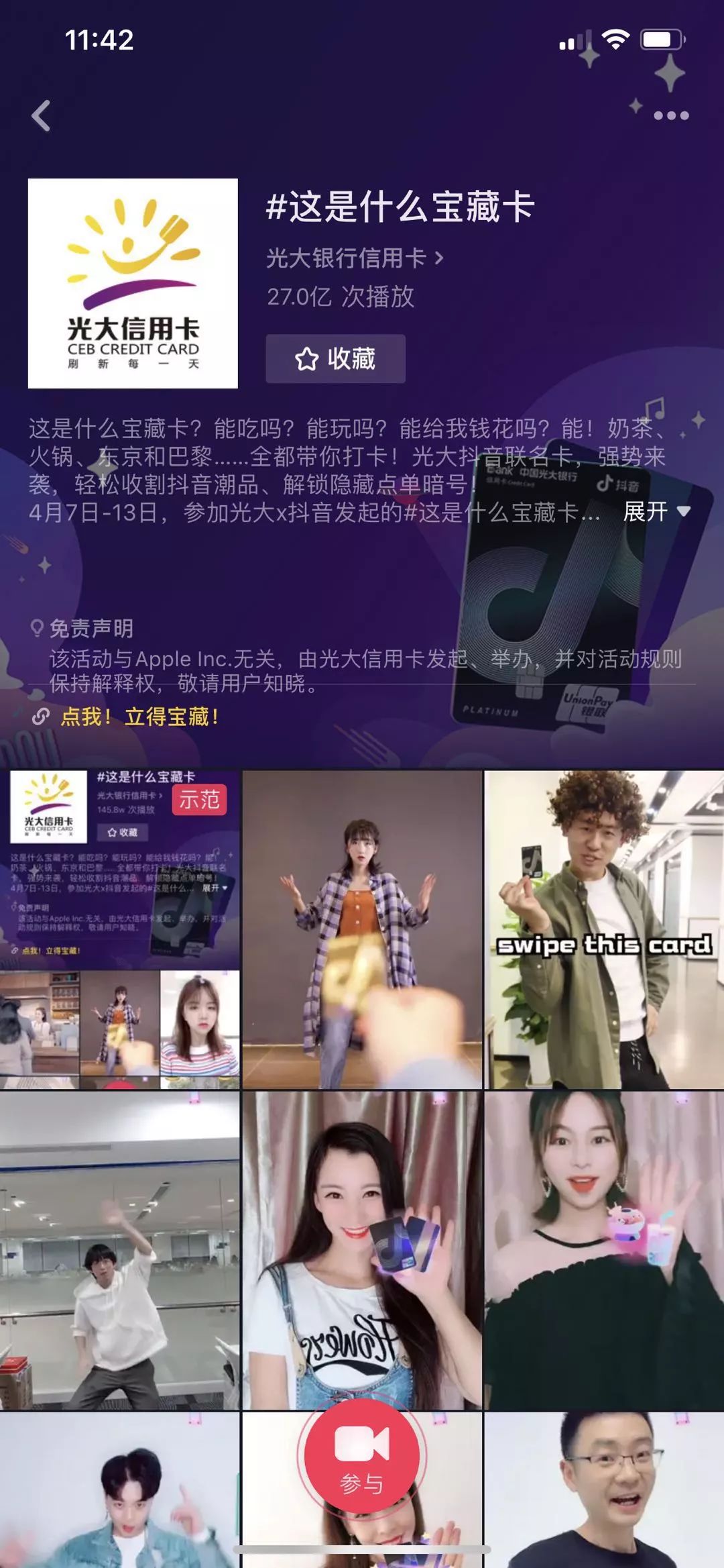 此外,光大银行信用卡还发起了一个#这是什么宝藏卡#的挑战赛,4月7日-13日,参与挑战赛的视频最终累计播放量超过27亿。