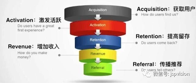 近年来在互联网行业异常火爆的增长模型,"AARRR"转化漏斗,也即:acquisition(获取用户)、activation(激发活跃)、retention(提高留存)、revenue(增加收入)、referral(传播推荐)
