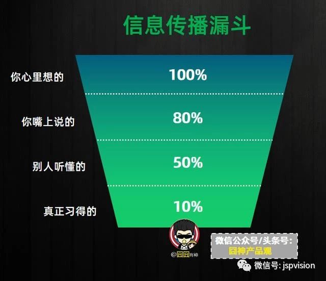 在做培训行业的小伙伴,其实也都会遇到被人diss的时候,"你教的东西没有用","你的东西不落地",殊不知背后其实存在这样一层层信息衰减的漏斗,培训师要表达的内容从原先自己心中想要传达的,到最后到培训对象手里时,可能就只剩下了10%的内容了,这是必然现象,最后的培训效果可想而知。