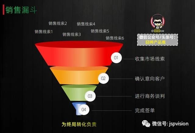 销售漏斗实质上较为抽象的还原了销售代表在市场中跑单的真实路径,大致会分为4个阶段,首先是收集市场线索,然后是确认意向客户,之后是进行商务谈判,最后是完成业务签单。销售人员在每一个阶段的工作重心也是不一样的,越往下层的漏斗走,越接近最终的交易转化。这个漏斗我们来详细讲解: