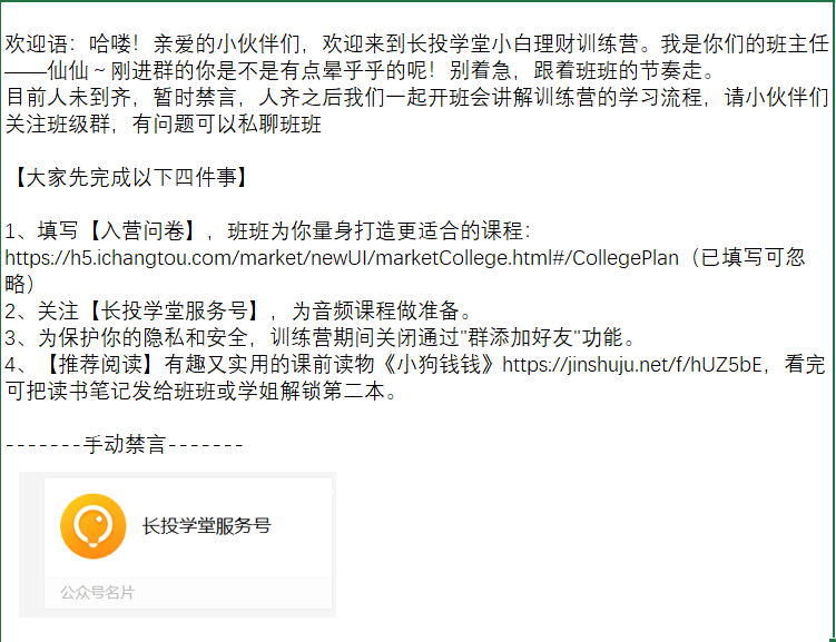 第一【禁言中】这个前缀,提醒用户目前群内状态,避免早进群用户闲聊,打扰未开班前新人进群的用户体验,同时也降低班班的管理工作量。千万不要小看这个群名这个细节,后续训练营期间很多重要提醒均为通过更改群名来实现。