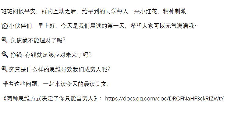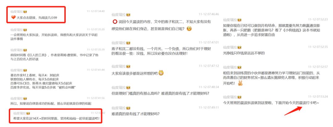 从截图的聊天记录上我们可以看出暗藏玄机,第一是引用名人的例子打鸡血刺激用户情绪,第二是灌输小白也能理财的思想,坚定用户学习信心。这么一波操作,在情绪达到high点的时候提示进行晨读打卡,后面紧跟着打卡模板,一套流程环环相扣,把握的恰到好处。