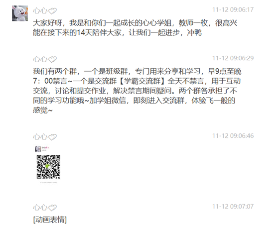 在晨读分享过后,这个阶段班级群开始禁言,因为是微信群,采取的方式为更改群名,同时学姐会出现引导大家进入交流群。以便还有需要的同学在交流群中进行沟通。