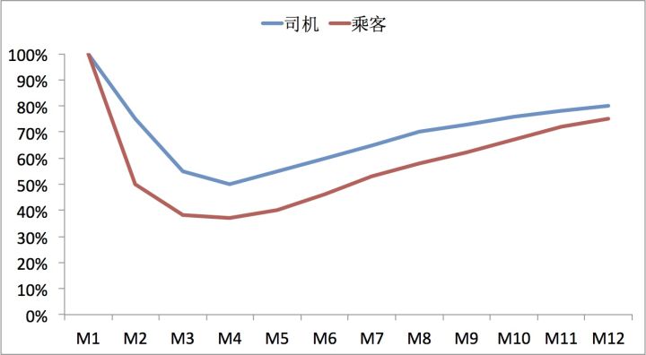 举个例子来解释。Uber新进入一个城市以后,司机端和乘客端的留存大概是这样的: