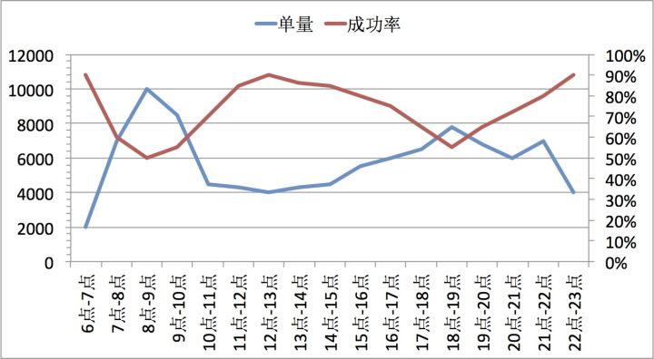 这个例子再延伸一下。如果把打车软件的在一天中不同时间的订单量和下单成功率画出来,估计是这样子的(根据个人经验画的,如有雷同纯属巧合):