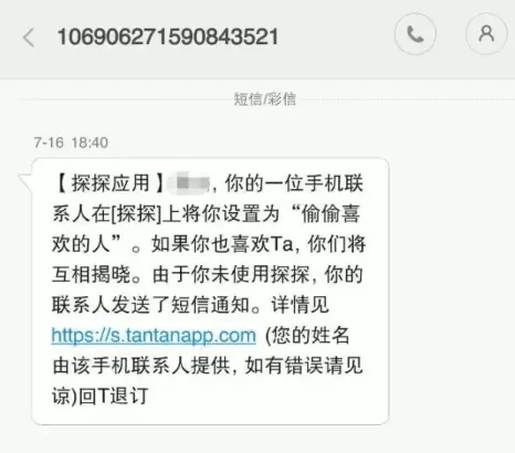 ”XX,你的一位手机联系人在[探探]上将你设置为“暗恋对象”。由于你未使用探探,你的联系人发送了短信通知。如果你也“暗恋”Ta,你们将配对成功。详情见网页链接 (你的姓名由该手机联系人提供,如有错误请见谅)“