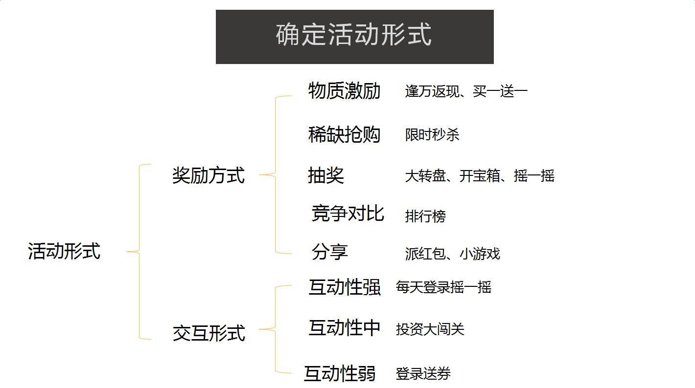你到底要给你的用户送什么礼物,什么样的活动形式可以让他死心塌地帮你完成KPI。在确定活动形式的时候首先要匹配你的目的。再来参照你以往做得好的活动形式,或者参考其他平台好的形式做一个结合。