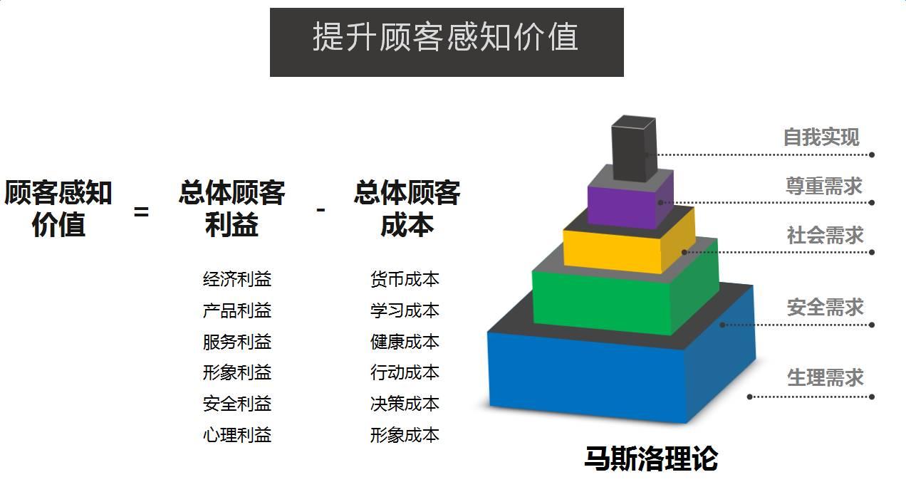 其实做活动就是为了提升用户的感知价值,从而促进他成交。一个简单的公式套用马斯洛理论,你就有很多方向去提升用户的感知价值。从马斯洛理论中我们知道从经济利益、产品利益、服务利益、安全利益可以提升顾客的利益,从顶端到底端,你也可以知道从哪个方向去入手给用户的利益程度会更大。我们也可以从减少用户的成本去实现。货币成本、人力成本、时间成本等等,这是一个非常通用的公式,只要你找准方向,就可以实现。