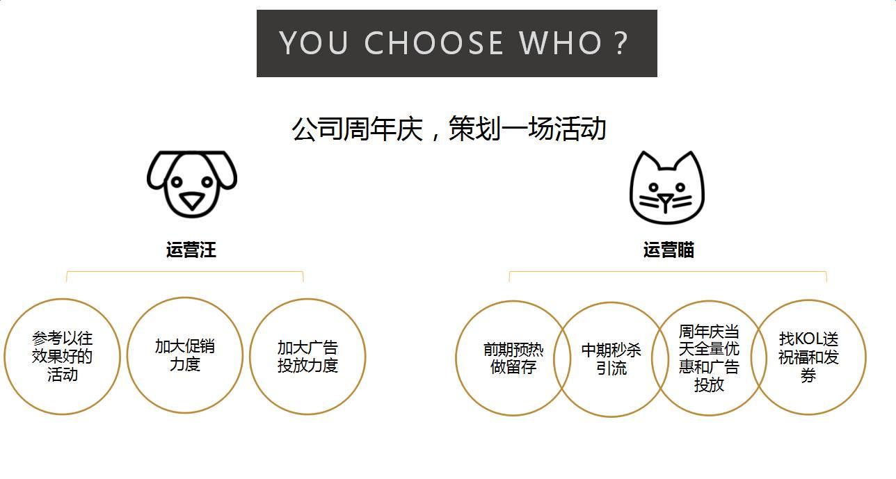 假如你是一家公司的老板,公司要举办周年庆,运营汪跟运营喵分别提供了他们的方案,你会选哪一个呢?