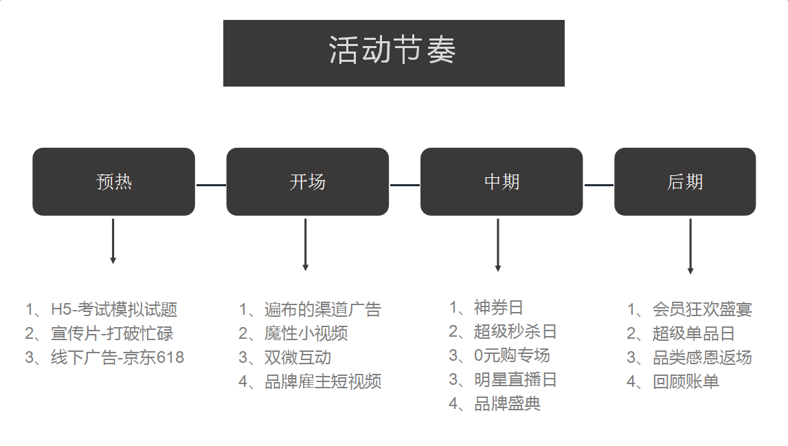 京东618也是有预热、开场、中期、后期。预热会有小小的广告片等等动作,开场的时候也是做遍地的渠道广告,相信没有人没看过京东618的广告。中期的时候他也是有送券、秒杀,通过这些点去刺激用户,后期的时候做返场活动的美好等,当然其中有很多没有提到的点。可是按照活动节奏来说,无论是大的电商平台还是小的平台的活动,套路都是差不多的,只是根据自己平台的一些特性去增加东西。