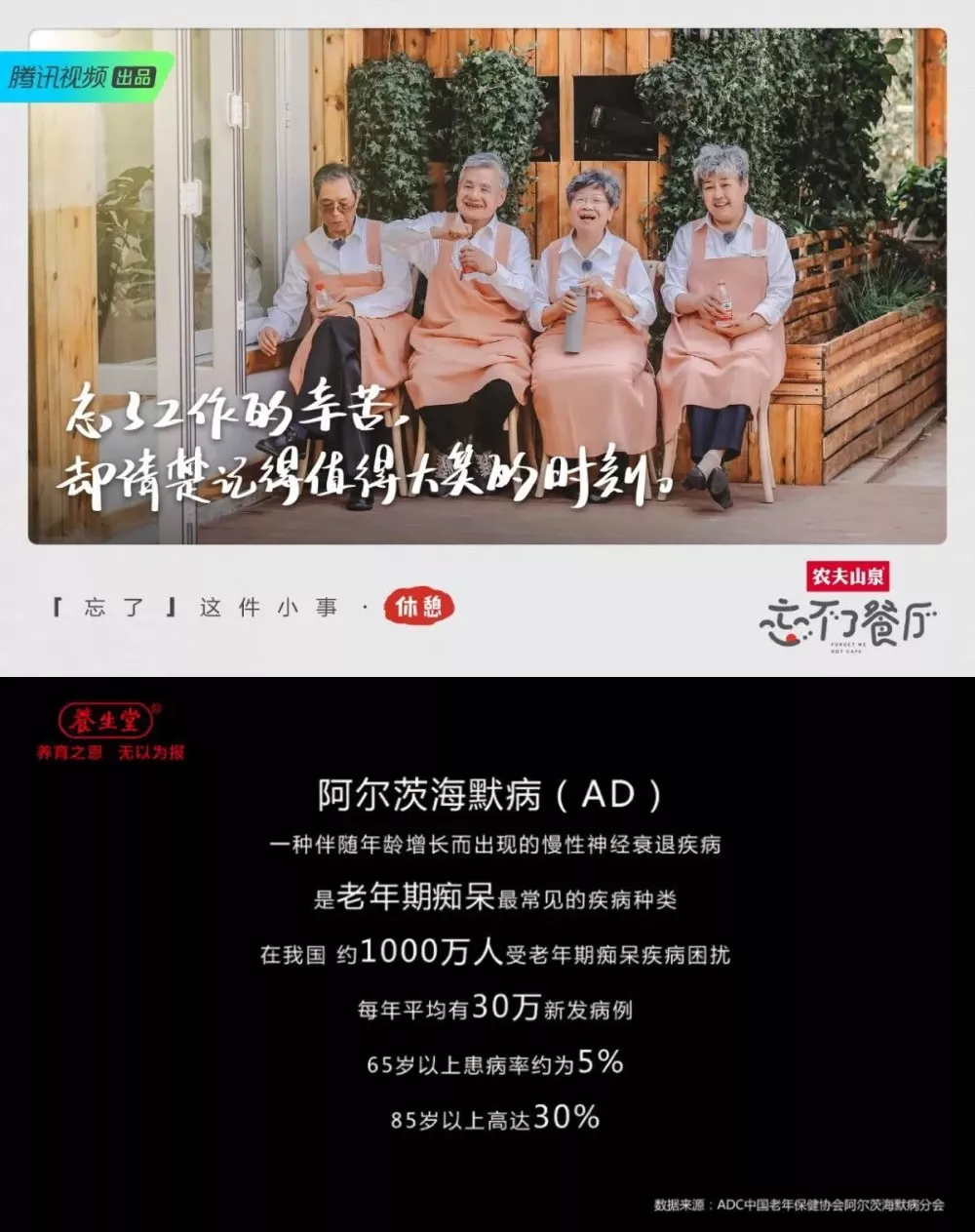 同样的高光瞬间还发生在《忘不了餐厅》中。与《忘不了餐厅》合作的养生堂(农夫山泉),在节目中的“低调”,以及在节目外拍摄了两支关于阿尔茨海默症的公益广告《爱不会忘记》的用心,在将观众对节目的关注转换到对现实生活中存在的阿尔茨默症人群关怀的同时,品牌价值理念也自然而然地传递给了公众。