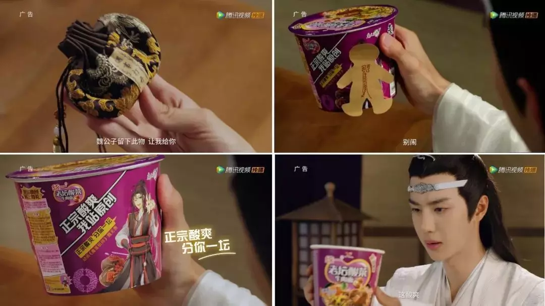 以今年大热剧集《陈情令》为例,为充分释放其IP的营销价值,腾讯视频以原著《魔道祖师》IP为起点,培育并开发了与之相关的一系列影视剧、动漫等内容载体。在《陈情令》的某一创意中插广告里,王一博饰演的含光君“蓝忘机”在面馆里吃起了“魏无羡”留给他的统一老坛酸菜牛肉面,该营销方式将已进入市场出售的二次元魏无羡的老坛酸菜牛肉面,与《陈情令》的三次元场景巧妙融合,统一老坛酸菜牛肉面也借此实现了品牌与粉丝受众的破次元对话。