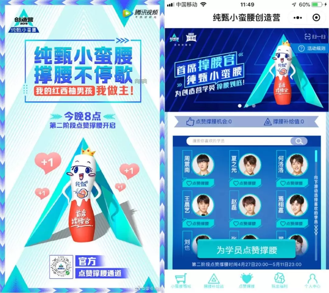 同样,在蒙牛纯甄小蛮腰与《创造营2019》合作时,也开发了创新玩法:将101位选手塑造为“红西柚男孩”,蒙牛纯甄小蛮腰以人格化的品牌形象成为“首席撑腰官”。赢得年轻用户好感后,借助线上小程序或线扫描投票等组合玩法,用户与粉丝可直接为喜欢的选手投票“撑腰”,品牌也借助粉丝经济而在内容、社交渠道和线下销售场景中,实现了与用户的深度对话。