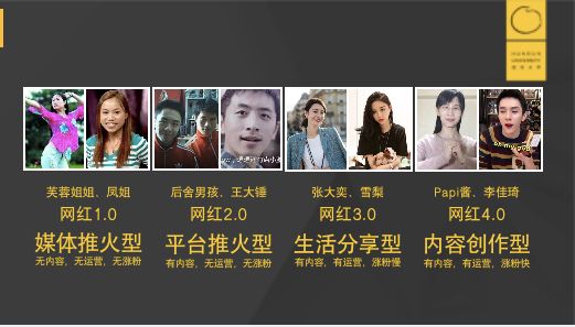 4.0时代,内容创作型。也就是我们今天讨论的网红,他们的核心特征都是通过创作内容,并在不同平台分发、运营,以此在全网积累粉丝。