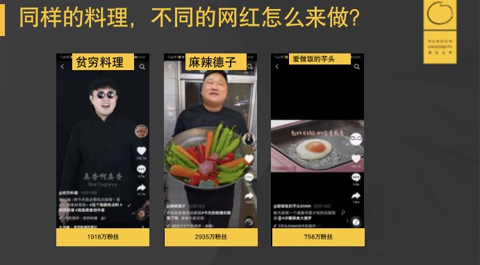 我们来看一下同样的美食,不同的网红是怎么做的?我分别选了在抖音上有2000万粉丝的贫穷料理、抖音3000万粉丝在全网都很火的麻辣德子、以及在Z世代年轻用户里比较知名,深受喜爱的抖音750万粉丝博主爱做饭的芋头SAMA。