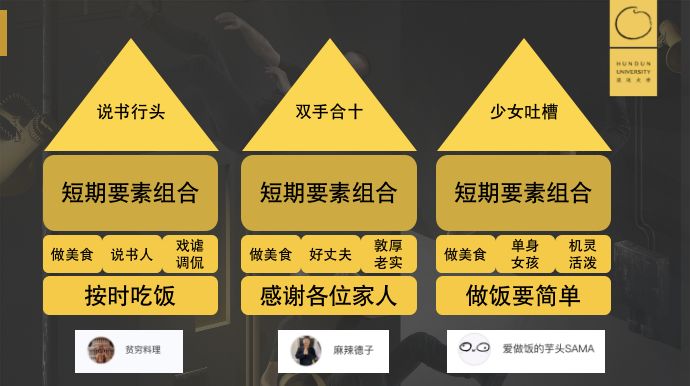 贫穷料理是一个说书人的身份,用戏谑调侃的方式做美食,他的价值主张是“贫穷只是暂时的,记得按时吃饭”。麻辣德子是一个敦厚老实的好丈夫,他的价值主张是“感谢各位家人”。而芋头SAMA是一个机灵活泼的单身女孩,她的价值主张就是“做饭要简单” 。其实这三位网红的都围绕着自己的价值观和核心魅力在生产内容。