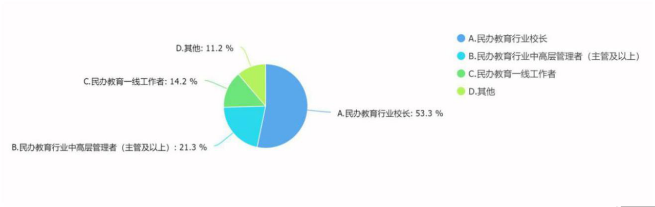 其中填写该问题的人数有 169 人,其中民办教育行业校长有 90 人,占比 53.3%,民办教育行业中高层管理者有 36 人,占比 21.3%,民办教育一线工作者 24 人,占比 14.2%,其他 19 人,占比 11.2%。通过用户身份,我们把除了民办教育行业中高层管理者以上的人员都筛除,只针对民办教育行业中高层管理者即校长进行调研。