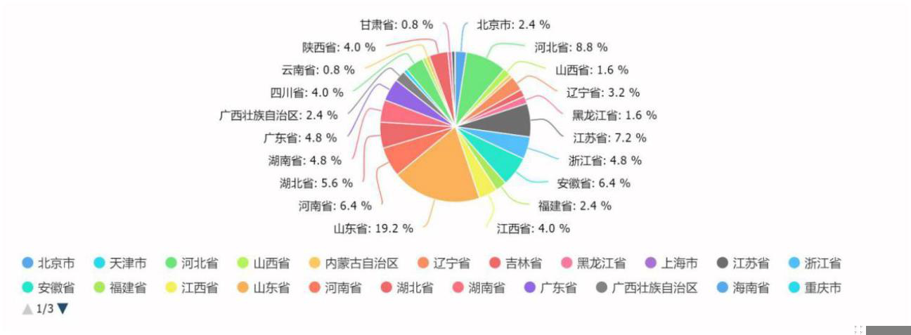 有效填写 125 人,基本中国每个省都有,其中最多的省份为山东省,24 人,占比 19.2%,