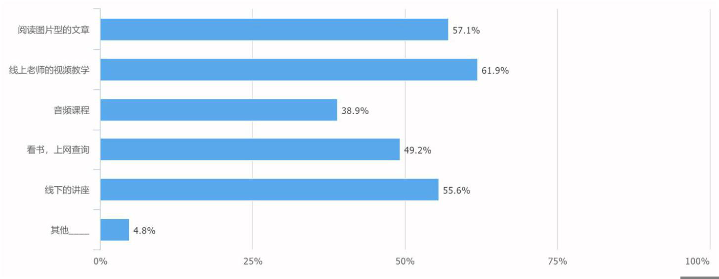 有效填写 126 人,其中 78 人偏向于线上视频学习,占比 61.9%,阅读文章占 57.1%,再其次就是线下讲座,占 55.6%,而比重最少的反而是音频课程,仅有 38.9%。