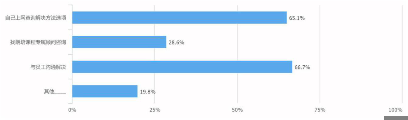 有效填写 126 人,其中与员工沟通解决 84 人,占 66.7%,自己上网查询解决方法 82 人,占 65.1%,其中找朗培顾问咨询的有 36 人,仅占 28.6%。