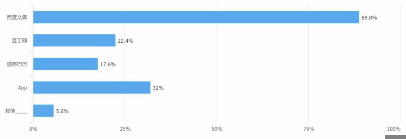 分析:下载资料的渠道,用户们还是用常规的百度进行查找,所以有 88.8%的用户,都会用到百度文库,其次随着移动互联网时代的来临,使用 App 下载资料的人也越来越多,占比 32%。所以,在我们 App 上可以多放一些文档资料,也作为一个引流的方式和功能。