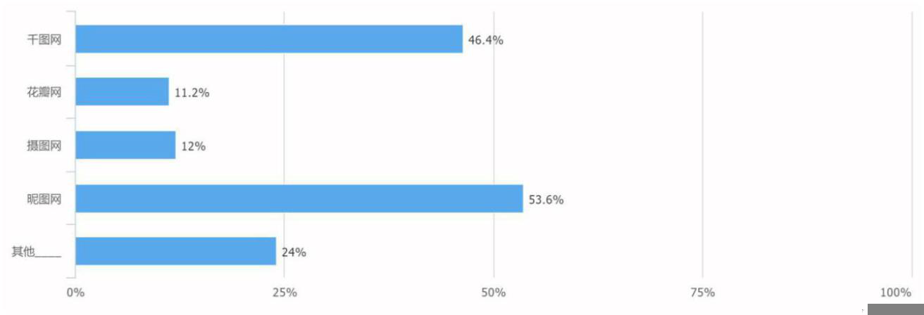 有效填写量 125 人,其中昵图网与千图网使用人数最多,有 67 人和 58 人,占比 53.6%,46.4%。其他渠道选择较多的为百度,或者有专人负责。