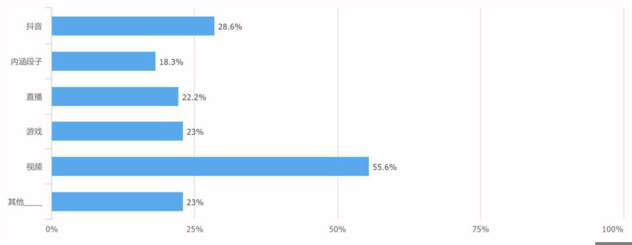 有效填写 126 人,其中使用视频软件的用户最多,70 人选择,占比 55.6%。而抖音占比也超过内涵段子,占比 28.6%。