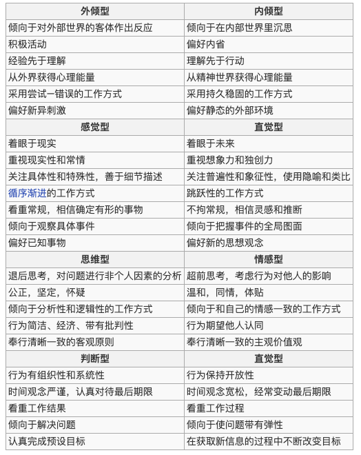 而荣格心理类型理论将人的心理类型分为外倾型、内倾型、感觉型、直觉型、思维型、情感型、判断型和直觉型8种。