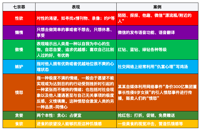 把以上罗列的马斯洛「马斯洛需求层次」,七宗罪等人类心理需求延伸、去重、整合建立用户心理需求表: