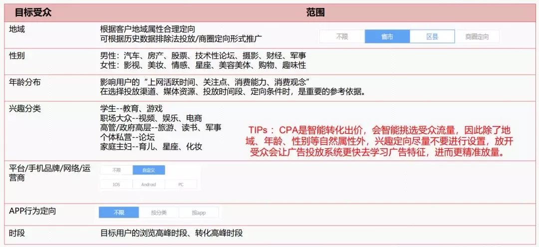 1)根据根据目标受众:结合产品的用户属性(如年龄、地域、性别、使用时间段等)设置,提升效果转化。