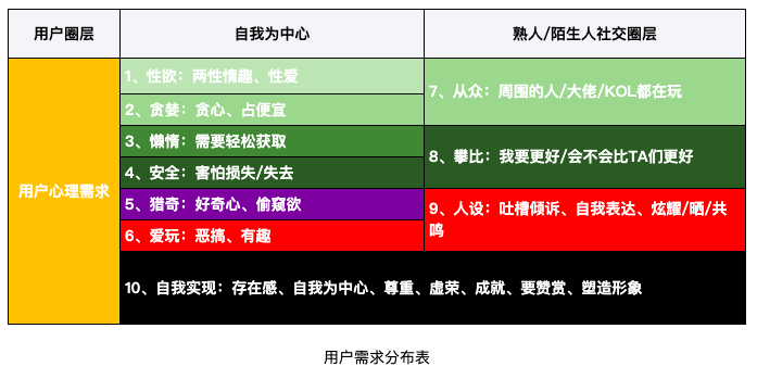 在补贴活动中,我们可以根据「用户需求分布表」分析,这种简单粗暴的活动激励措施中,满足的是用户占便宜、从众、害怕失去和人设方面的心理需求。