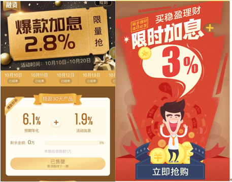 这种玩法在电商中最常见,一般是商家在控制商品成本时,通过限时限量在短时间内吸引大量用户参与活动并从中获取盈利;在金融产品中则一般通过限时加息或者免费送出礼品吸引用户投资。