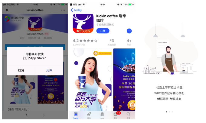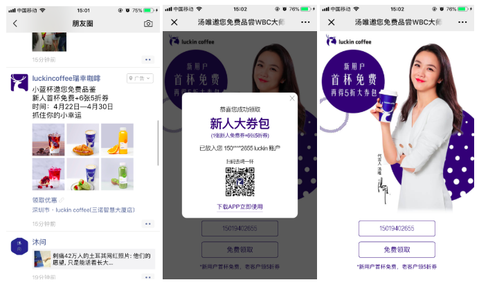补充:,笔者终于被瑞幸咖啡认定为它的精准用户画像,大家看看,下面就是在笔者朋友圈被安利的一波广告,这“免费、6张5折券”极具杀伤力的广告词以及4张常人难以抵抗的产品图,笔者乖乖就直接下载了,最后妥妥的领了一框券。