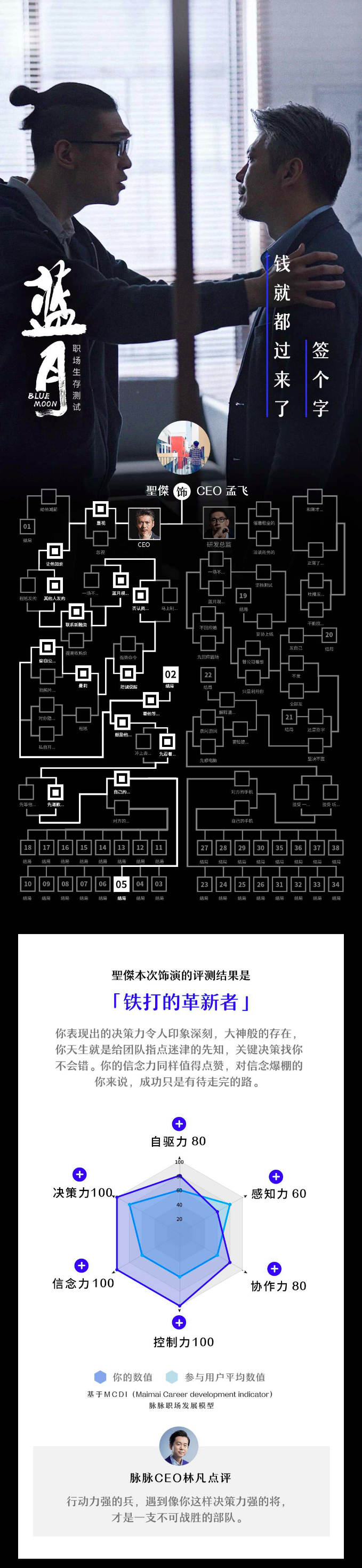 主要特点是将测试过程就是职场场景,且利用视频的方式来表达测试题目,让用户在关键节点选择答案,最后生成38种测试结果。