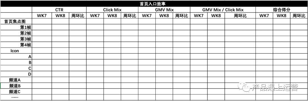 可以在前述首页管理指标体系中选取关注的一组指标,同样以周为单位进行统计,观察每个资源位效率的周环比和年同比(如果同一个频道占据同一个入口)波动情况和连续变化趋势,并进行分析。