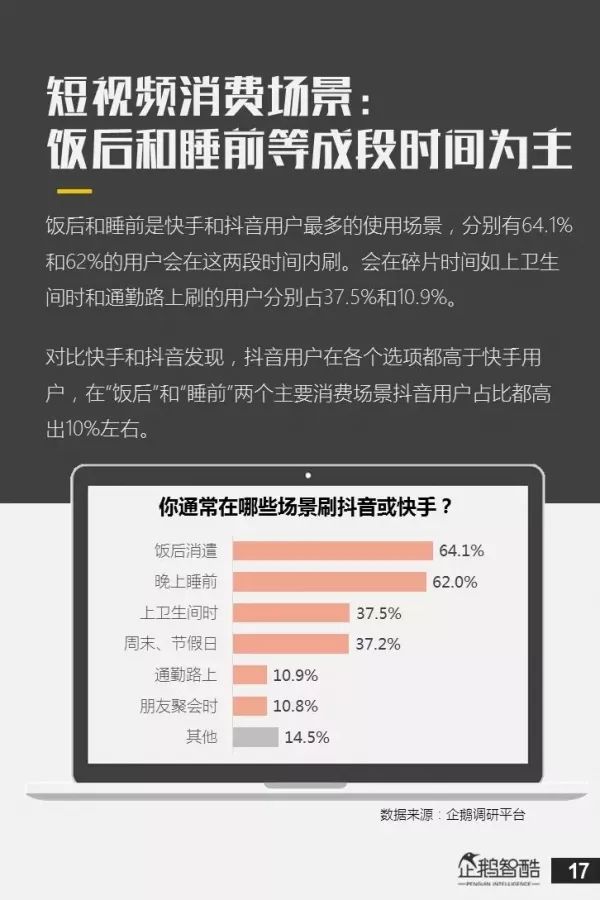 这可能是对短视频的最大误解。你通常在什么时间内刷抖音或快手?我们通常说移动传播用的是大家碎片化时间,通常会认为场景是发生在等车的时候,等电梯的时候,大家吃饭的时候有一搭没一搭的聊着的时候,但是事实上是不是这样?