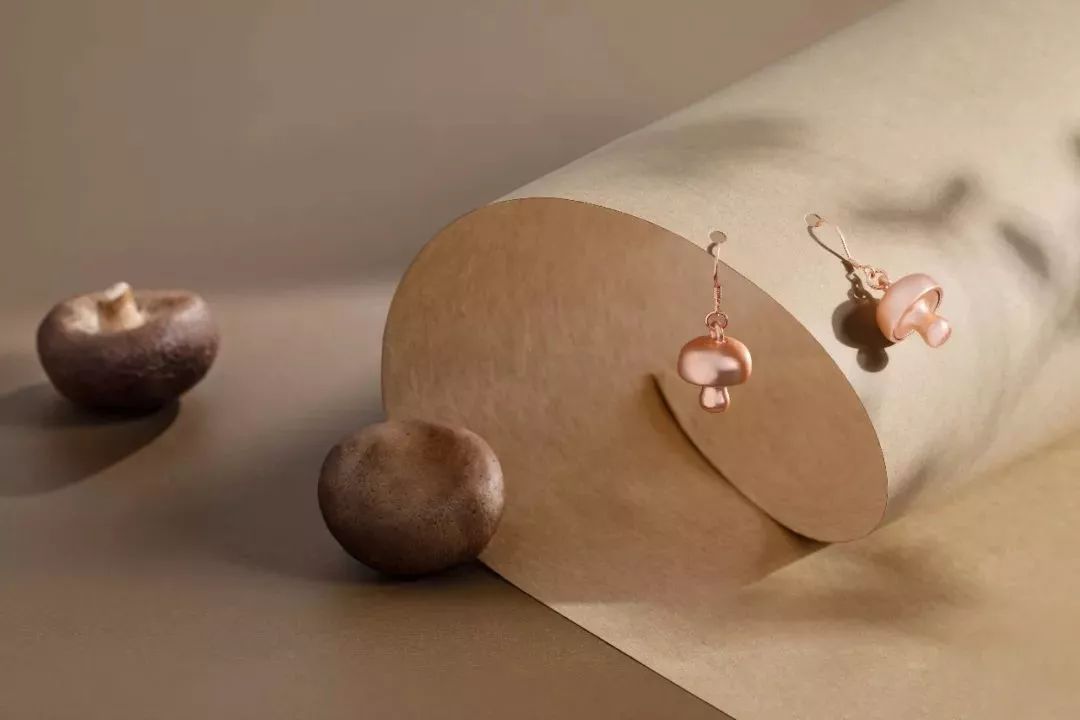 最近推出的,是一套玫瑰金食材系列耳饰,均以火锅配料为原型,分有四款:八角、蘑菇、莲藕、辣椒。