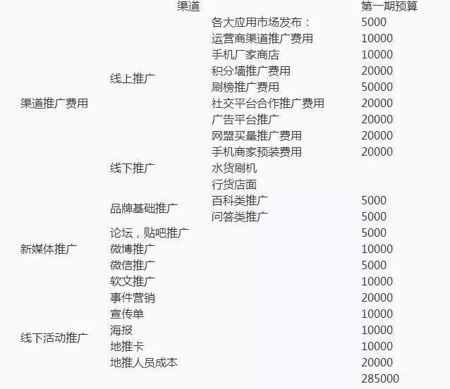 根据以上推广方案对各渠道做预算配比,与老板敲定最后的第一期投放预算。