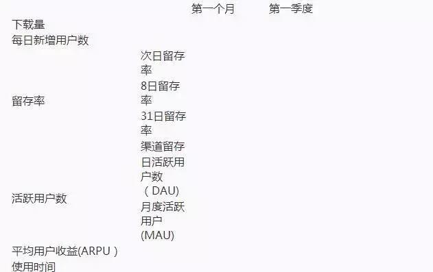 下载量 每日新增用户数 留存率 活跃用户数 平均用户收益(ARPU) 使用时间